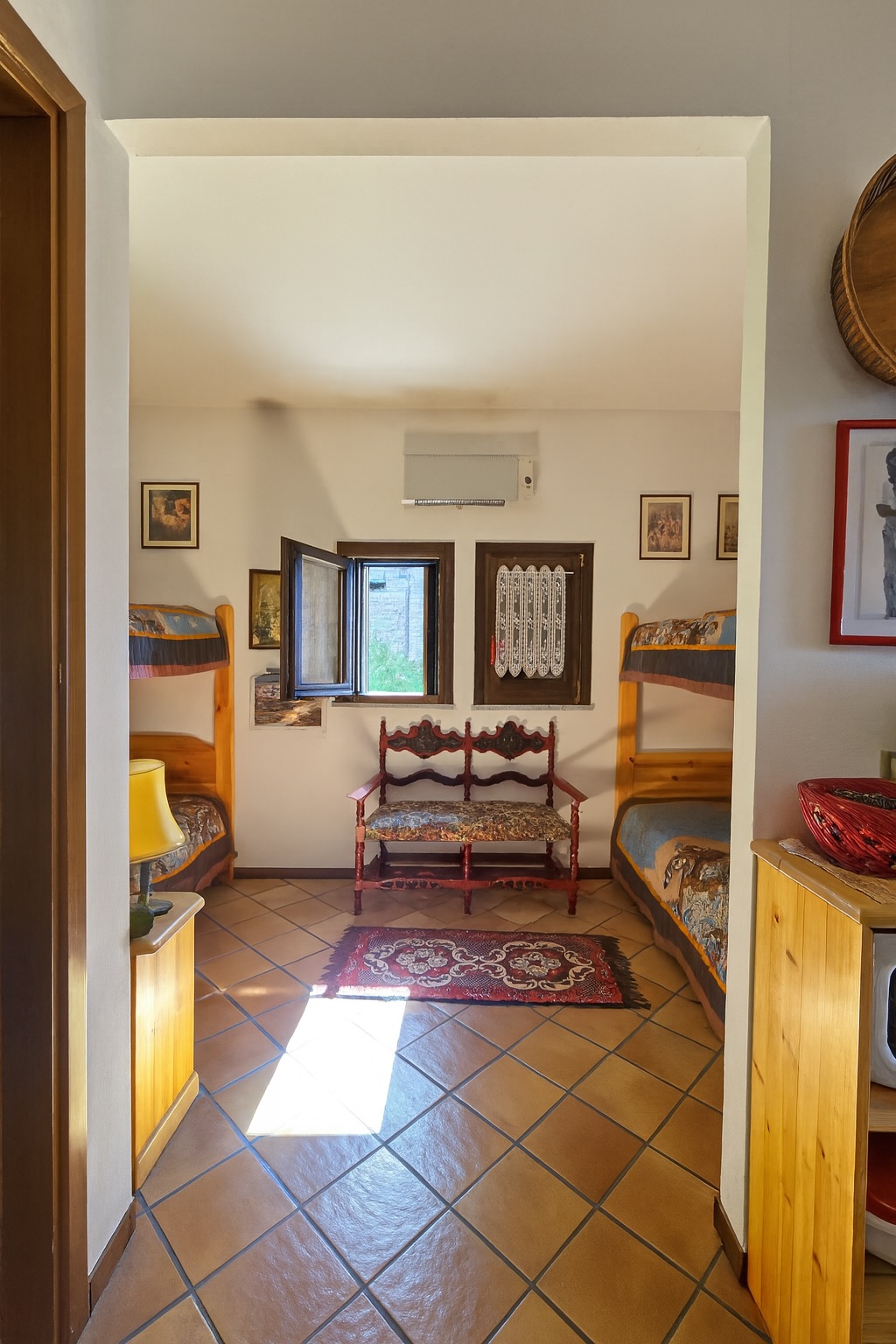 Accogliente bilocale con soggiorno con camino e angolo cottura, camera quadrupla, bagno finestrato e terrazzo privato panoramico. Completamente arredato