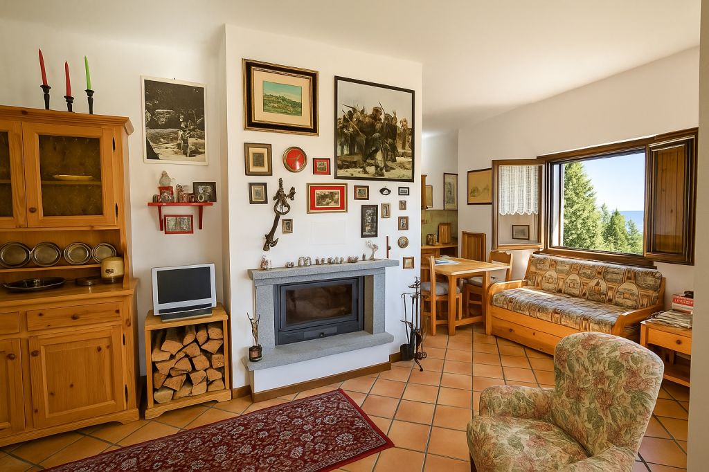 Accogliente bilocale con soggiorno con camino e angolo cottura, camera quadrupla, bagno finestrato e terrazzo privato panoramico. Completamente arredato